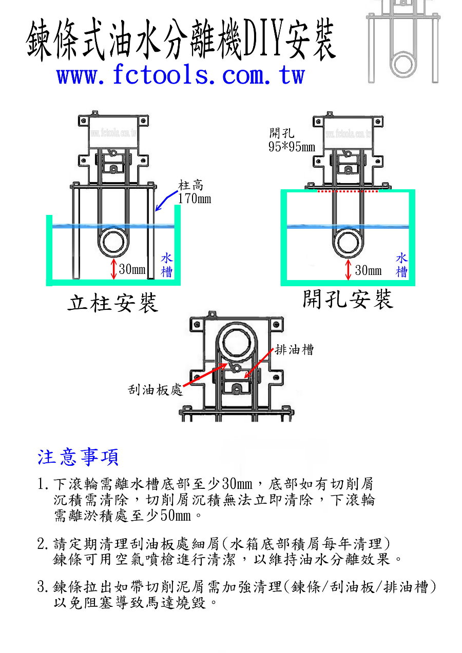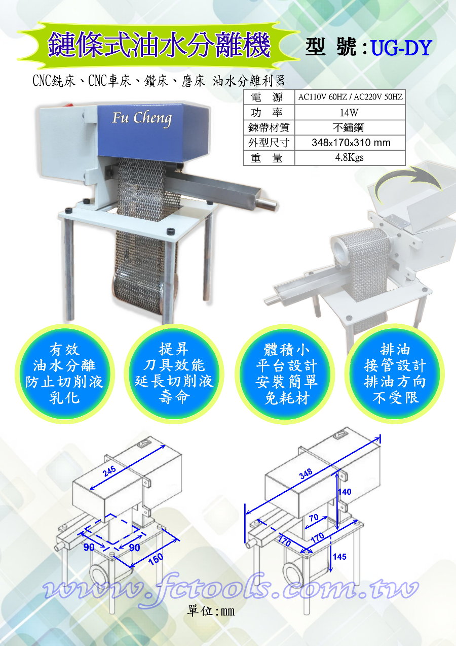 鍊條式油水分離機UG-DY 鍊條式油水分離機 *可安裝於CNC 水箱, 餐飲業,回收場,集油槽之水面浮油撈除* *有效的油水分離提升刀具及切削液壽命* 可選配 : (1)廢油桶滿油自動停止 (2)循環運轉/連續運轉切換 (3)運轉定時關機